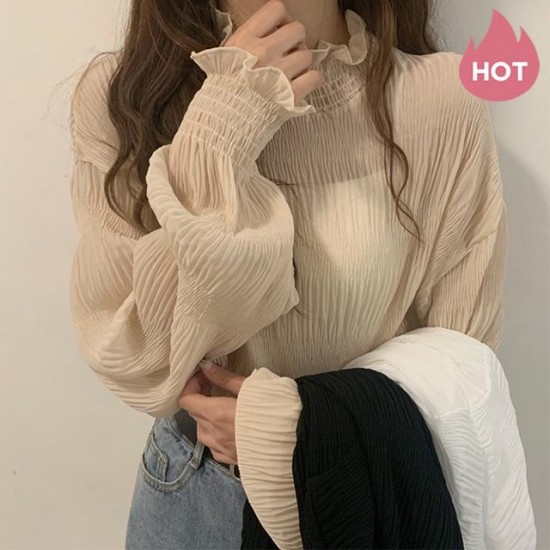 長袖スウィートスピーカースリーブホワイトブラックアプリコットシャツ?ブラウス