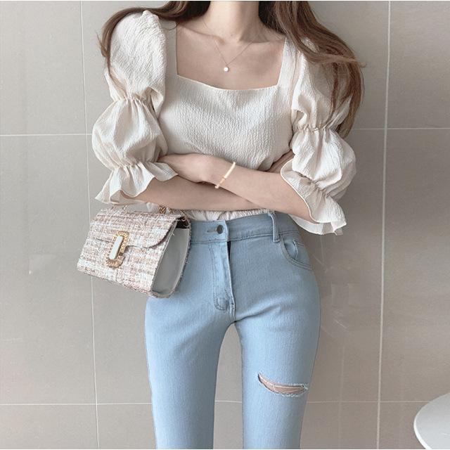 スクエアネックパフスリーブレトロ着痩せカジュアルシャツ