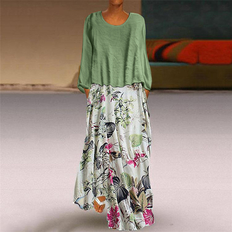 Cotton Linen Print Loose Long Sleeve Two Piece Large Size Maxi Dress