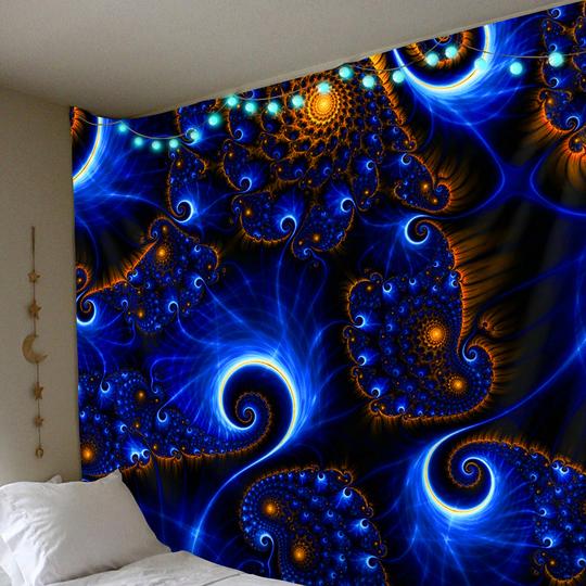 The Fibonacci Void Tapestry is a colorful and beautiful piece that will show off a new aesthetic to your room. The tapestry features a vast and seemingly endless Fibonacci void of blue and gold colors.