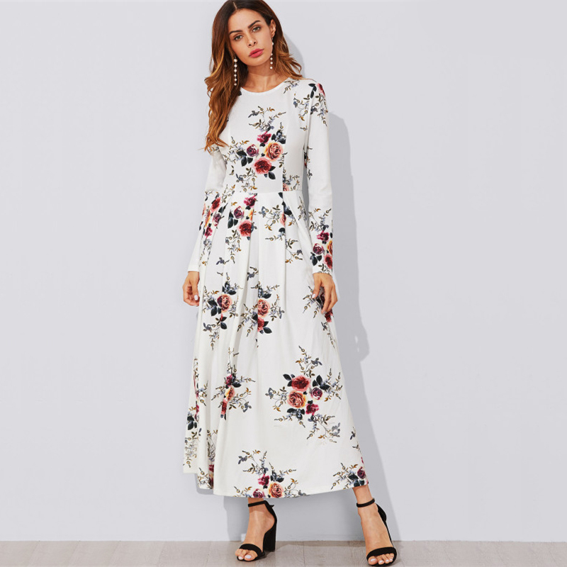 Flower Print Box Pleated A Line Dress Casual Women Autumn Dresses White Long Sleeve Floral Elegant Maxi Dress