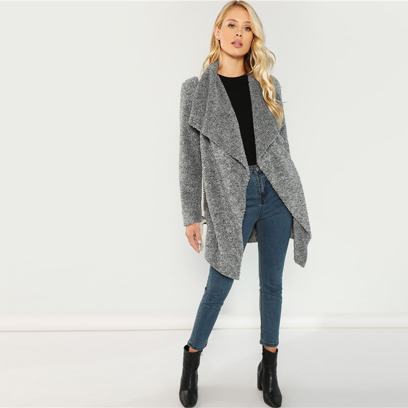 Grey Office Lady Elegant Waterfall Collar Solid Knee Length Teddy Coat 2018 Autumn Casual Fashion Women Coats Outerwear