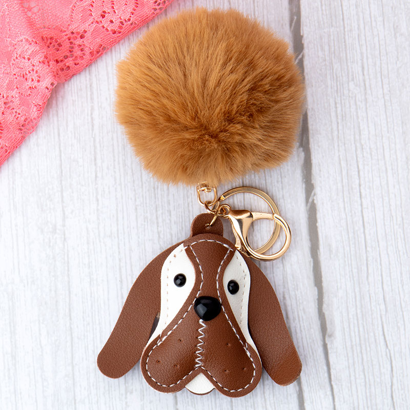 Leather dog key chain pendantLeather dog size: 6.5cm long and 8cm wideLength of leather rope: 9.5cmDiameter of hair bulb: 7cm (comfortable feeling, no hair shedding)Uses: bag pendant, car/key chain