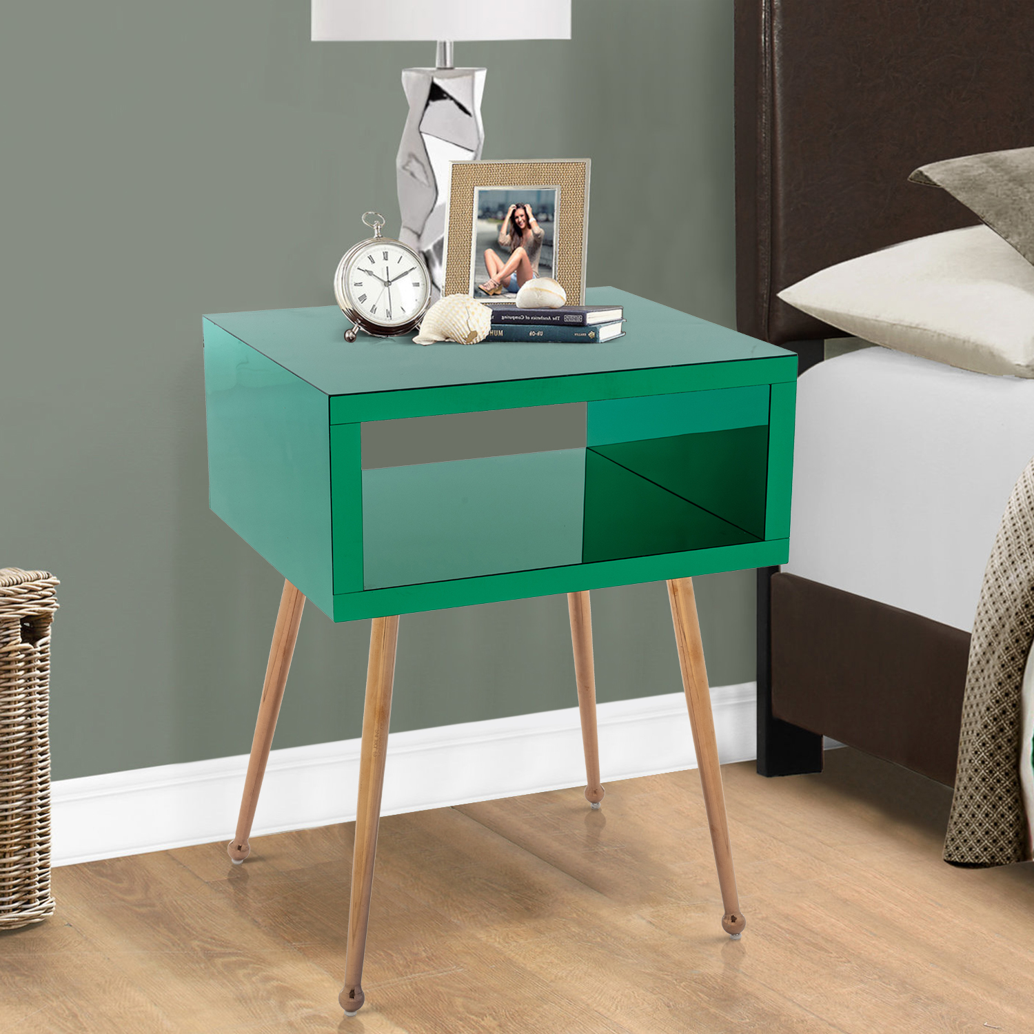 Modern Mirror Finished Side Table with Gold Metal Legs, Contemporary Night Stand Bedroom Side Table, Acrylic Mirror Side Table in Green Finish