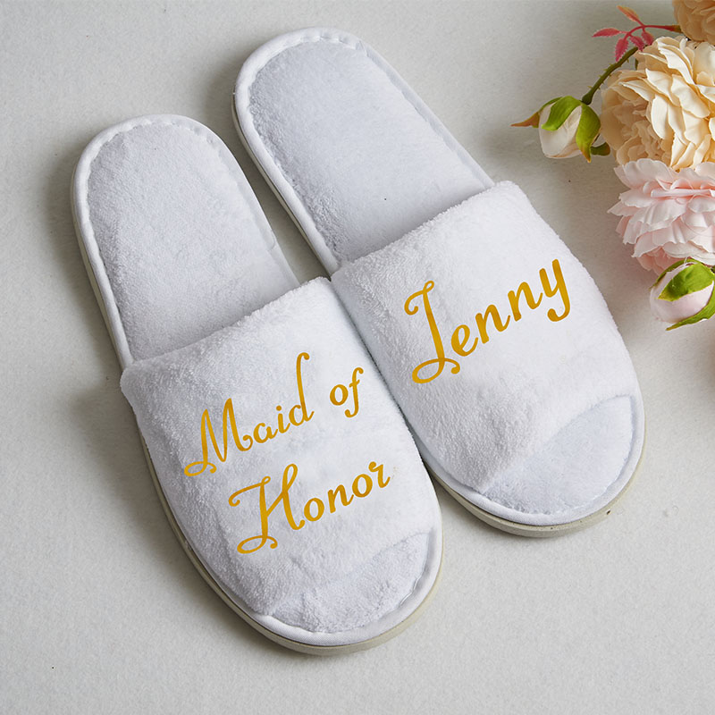 Personalised Bride slippers with gold wording, these will make a great gift for you to put in your "will you be my bridesmaid" box on  bridal party evening.