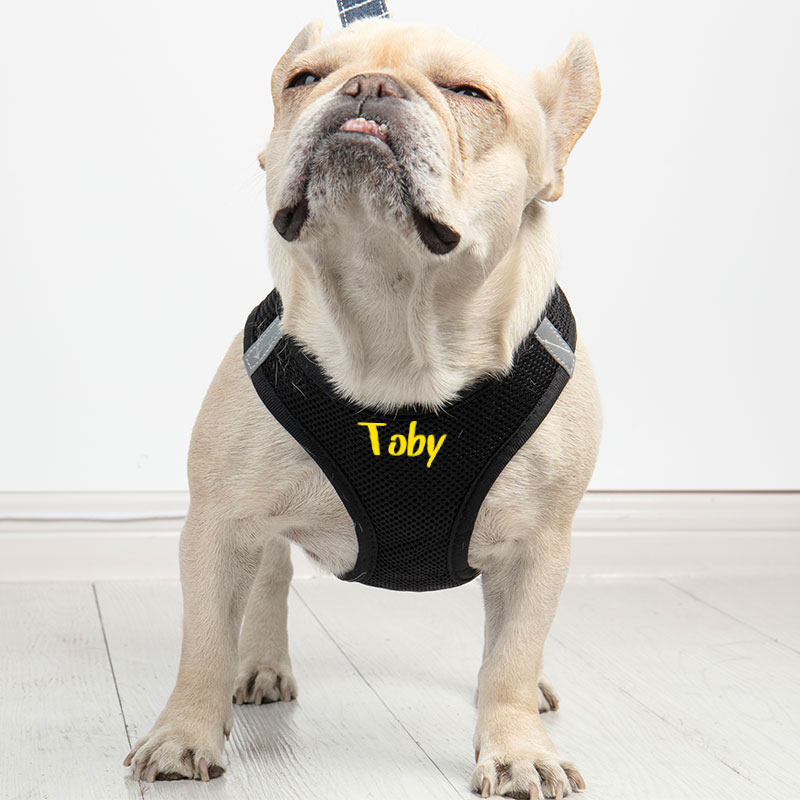 Fully adjustable chest strap.Made from padded breathable fabric which allows for fast drying.Black metal d ring to attach lead and branded rubber logo badge and clip buckles.