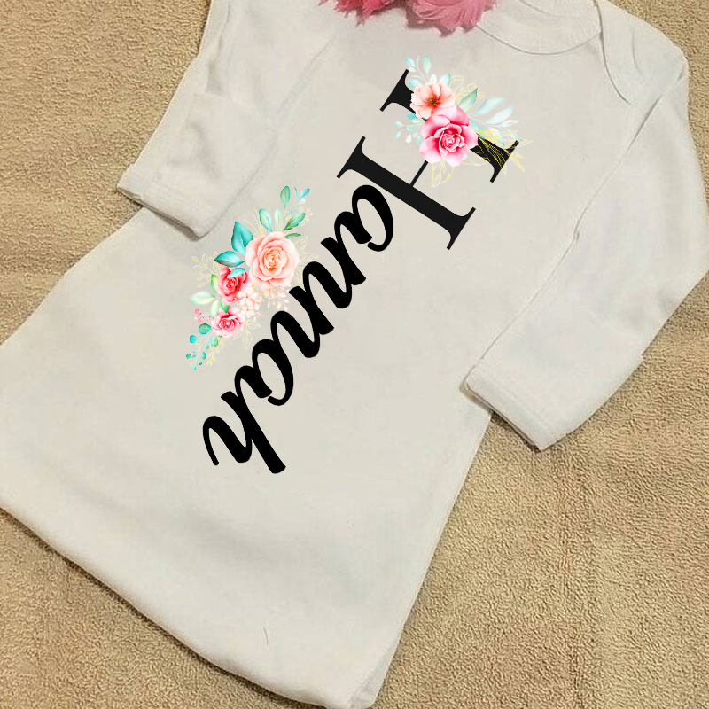 This darling gown is a truly unique little gown. With her name printed down the gown in a stunning black, and pink floral design. This gown is just perfect for those darling newborn pictures.