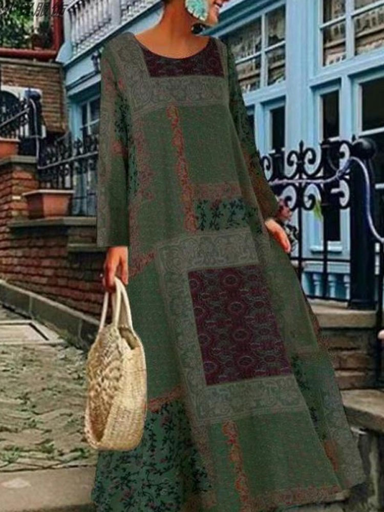 Round Neck Long Printed Dress Long Sleeve Ethnic Wind Maxi Dress