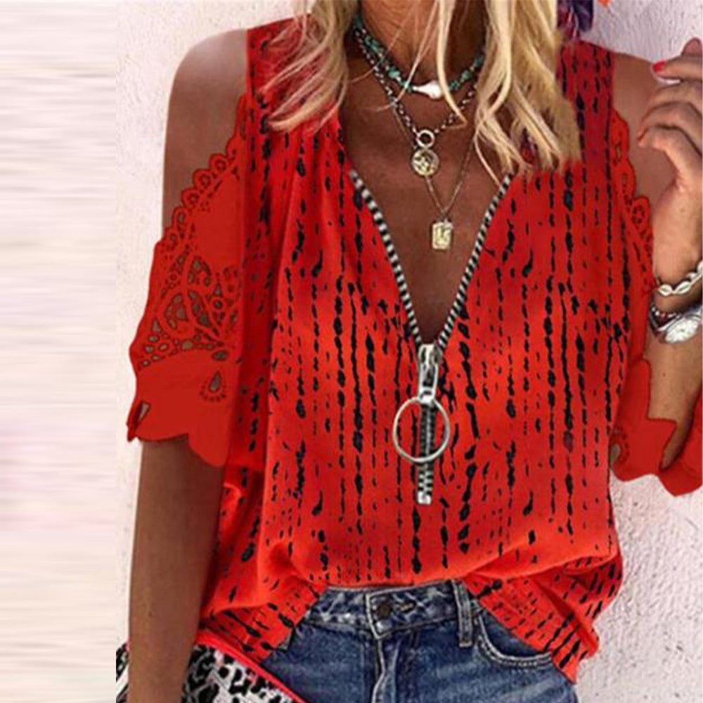 This short-sleeved top is suitable for hot summer. The shoulders are hollowed out to show the shoulder line and highlight the unique charm of women. The printing on the clothes adds a sense of fashion. The neckline has a zipper opening, fashionable, booming new ideas. It is sexy and comfortable to wear. Suitable for going out.