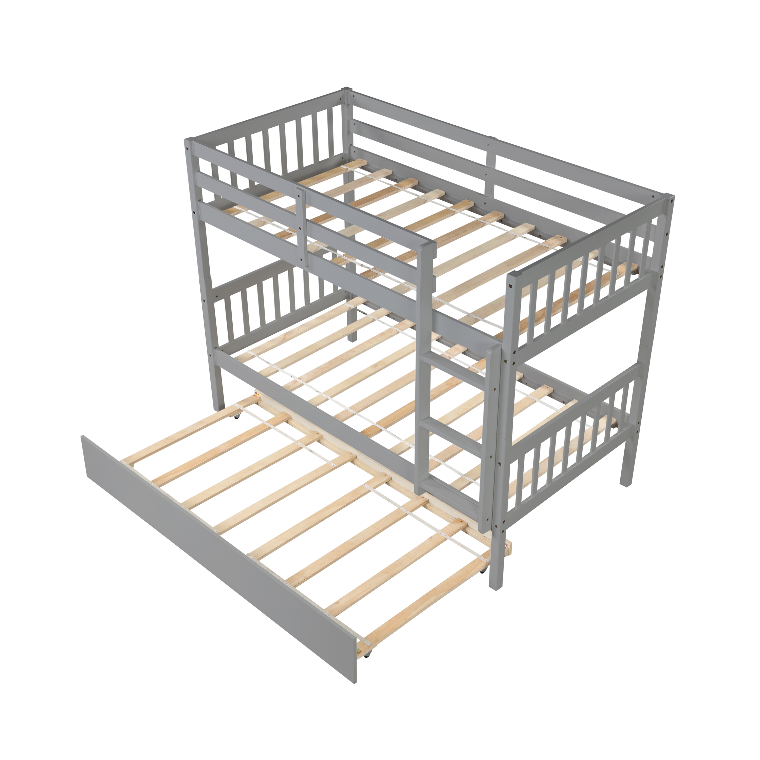 Twin Over Twin Bunk Bed with Pull-Out Trundle, Kids Wooden Bunk Bed with Trundle, Safety Rail and Ladder, Easy Assembly, Grey