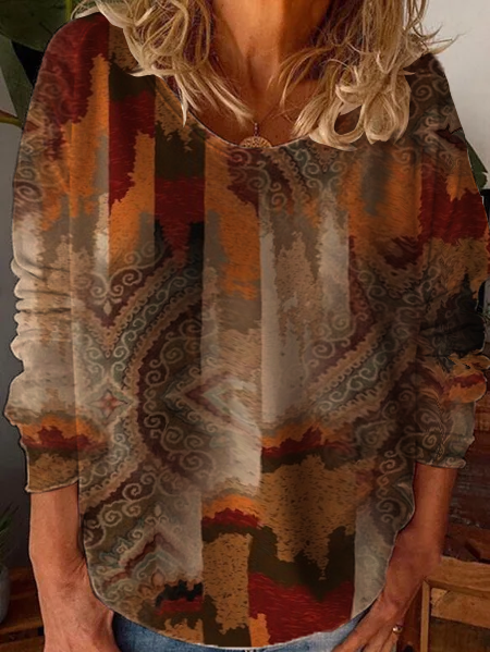 Women's Spring Vintage Print V-Neck Long Sleeve T-Shirt
