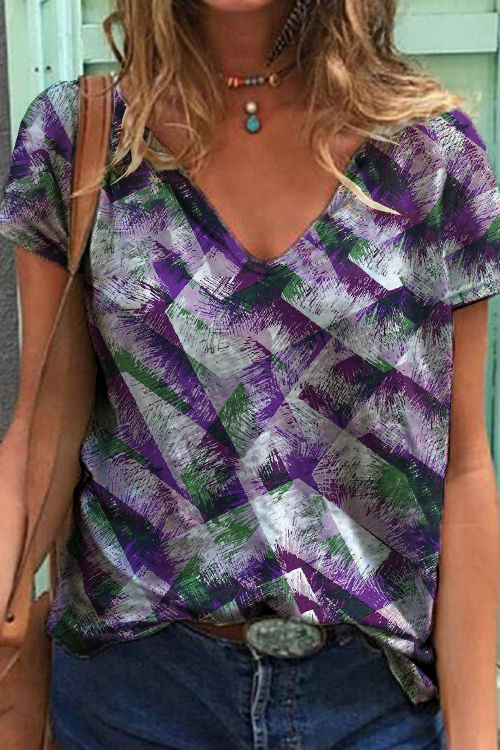 Women's Summer Purple Tie Dye Printed V-Neck Short Sleeve T-Shirt