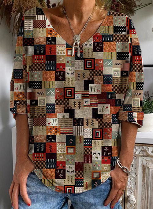 Women's V-Neck Colorful Graphic Panel Long Sleeve T-Shirt