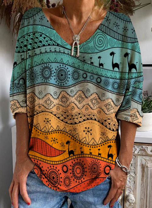 Women's V-Neck Fashion Patchwork Printed Long Sleeve Top
