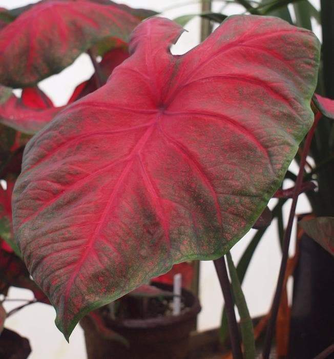 • Fancy-leaf caladiums generally have large heart-shaped leaves, sometimes growing to more than a foot long.