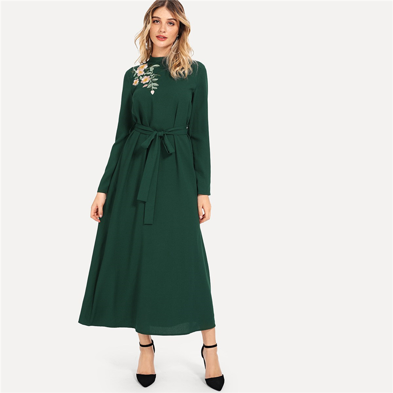 Green Elegant Party Flower Embroidered Mock Neck Long Sleeve Belted Natural Waist Maxi Dress Autumn Fashion Women Dresses