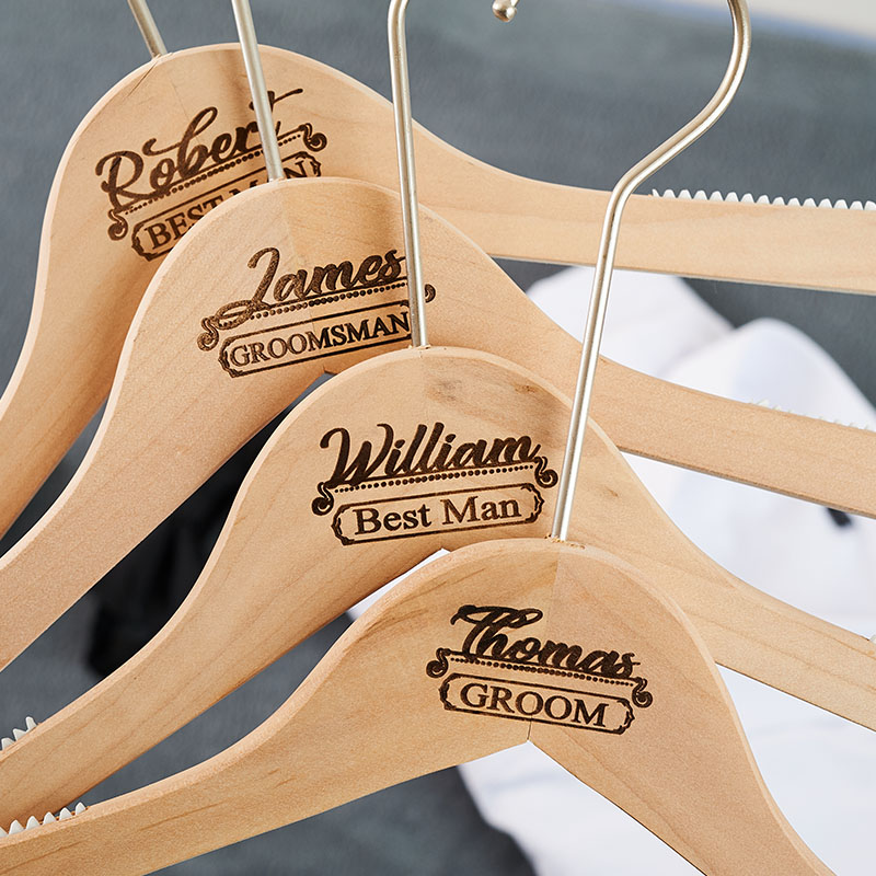 Personalized tuxedo hangers with Suit Up pants hanger for the Groom and his Groomsmen on the Wedding day.