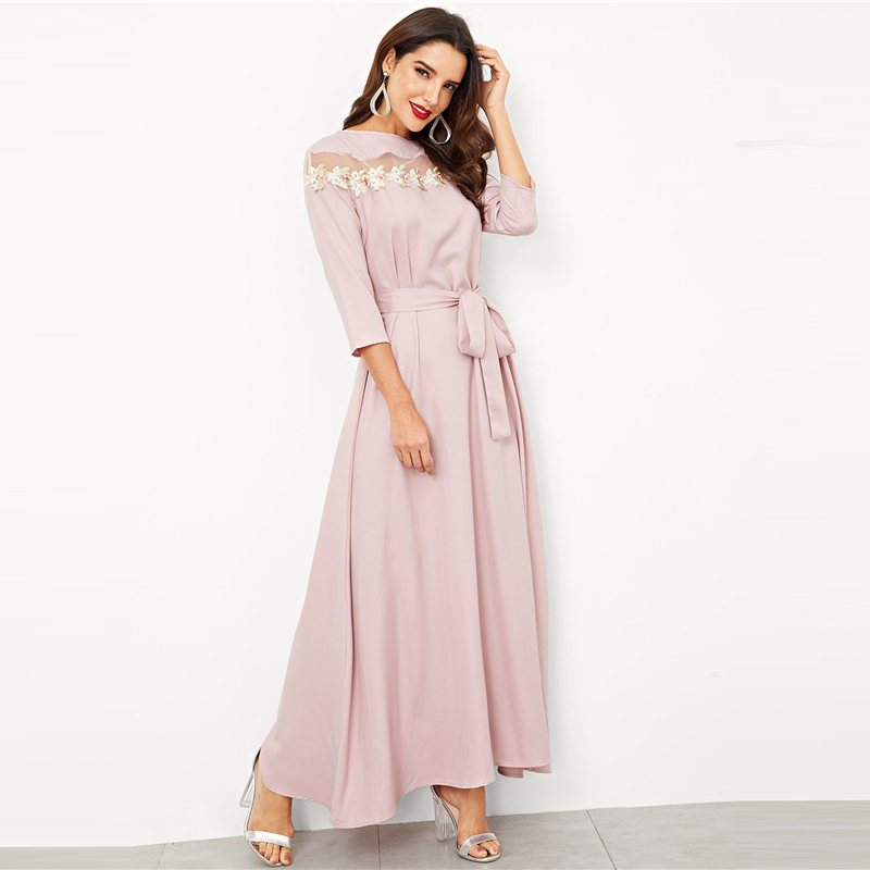 Pink Mesh Contrast Appliques Belted Elegant Dress Women Autumn Streetwear Contrast Mesh Appliques Belted Dresses